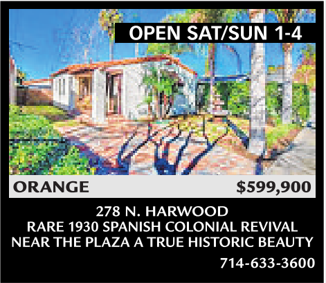 278 N. HARWOOD RARE 1930 SPANISH COLONIAL REVIVAL NEAR THE PLAZA A TRUE HISTORIC BEAUTY 714-633-3600