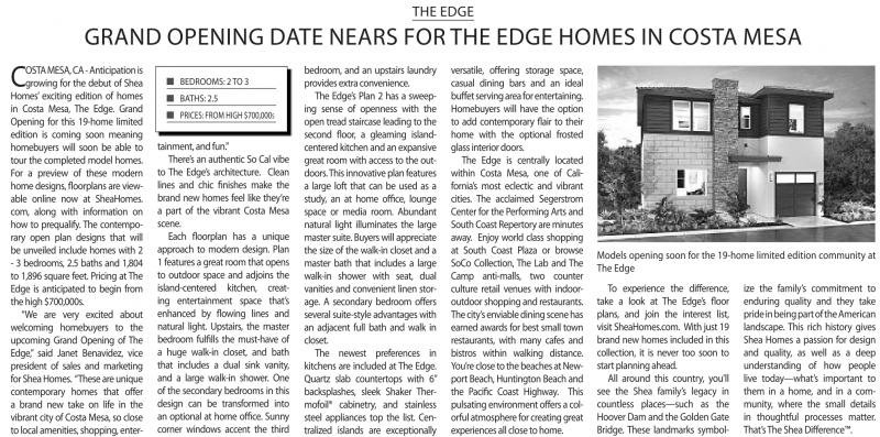 Ca -anticipation is growing forthe debut of shea Homes’exciting edition of homes in Costa Mesa, The edge. Grand Opening for this 19-home limited edition is coming soon meaning homebuyers will soon be able to tour the completed model homes. for a preview of these modern home designs,floorplans areviewable online now at sheaHomes.