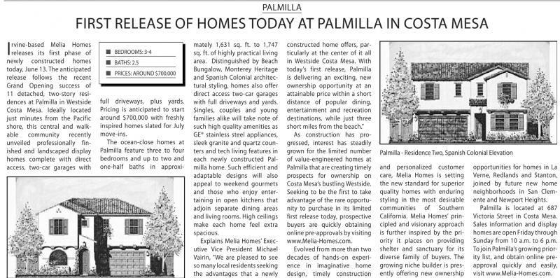Melia Homes releases its first phase of newly constructed homes today, June 13. Theanticipated release follows the recent Grand Opening success of 11 detached, two-story residences at Palmilla in Westside Costa Mesa. Ideally located