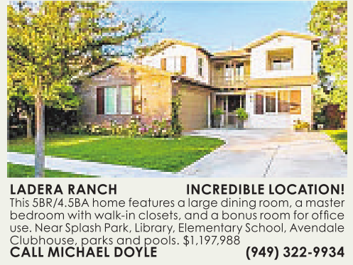 LADERA RANCH INCREDIBLE LOCATION! This 5BR/4.5BAhome features alarge diningroom, amaster bedroom with walk-inclosets,and abonusroomfor office use.NearSplash Park,Library,ElementarySchool, Avendale Clubhouse, parks and pools. $1,197,988 CALL MICHAEL DOYLE (949) 322-9934