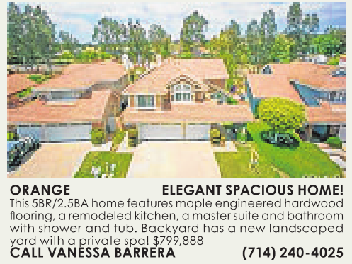 This 5BR/2.5BA homefeaturesmaple engineeredhardwood flooring, aremodeledkitchen,amastersuite and bathroom with shower and tub. Backyard has anew landscaped yard with aprivate spa! $799,888 CALL VANESSA BARRERA (714) 240-4025