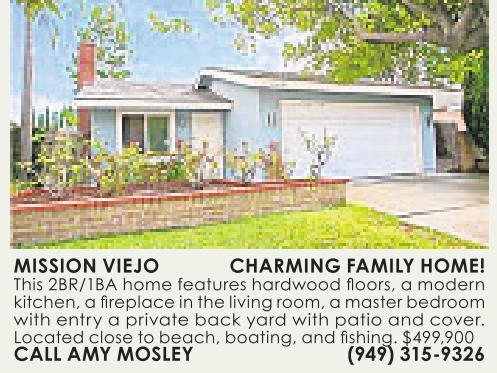 MISSION VIEJO CHARMING FAMILY HOME! This 2BR/1BA home features hardwood floors, amodern kitchen, afireplaceinthe living room,amasterbedroom with entry a private back yard with patio and cover. Located close to beach, boating, and fishing. $499,900 CALL AMY MOSLEY (949) 315-9326