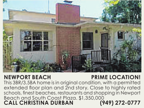 This3BR/3.5BA home is in original condition, with apermitted extended floor plan and 2nd story. Close to highly rated schools,finest beaches, restaurantsand shoppinginNewport Beach and South Coast Plaza. $1,350,000 CALL CHRISTINA DURBAN (949) 272-0777