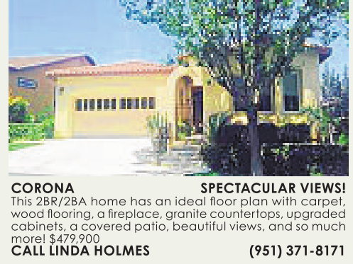 This 2BR/2BA home has an ideal floor plan with carpet, wood flooring, afireplace, granitecountertops, upgraded cabinets, acovered patio, beautiful views, and so much more! $479,900 CALL LINDA HOLMES (951) 371-8171