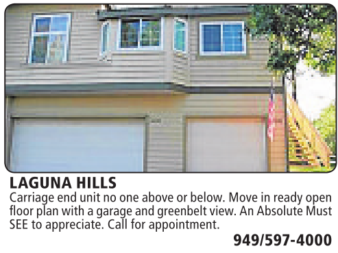 LAGUNA HILLS Carriageend unit no oneabove or below. Move in readyopen floor plan with agarageand greenbeltview. An Absolute Must SEEtoappreciate. Call for appointment.