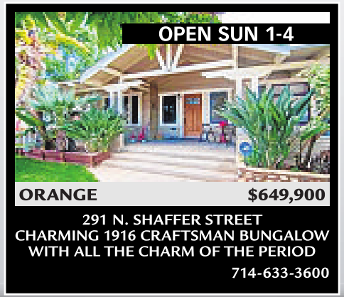 291 N. SHAFFER STREET CHARMING 1916 CRAFTSMAN BUNGALOW WITH ALL THE CHARM OF THE PERIOD 714-633-3600