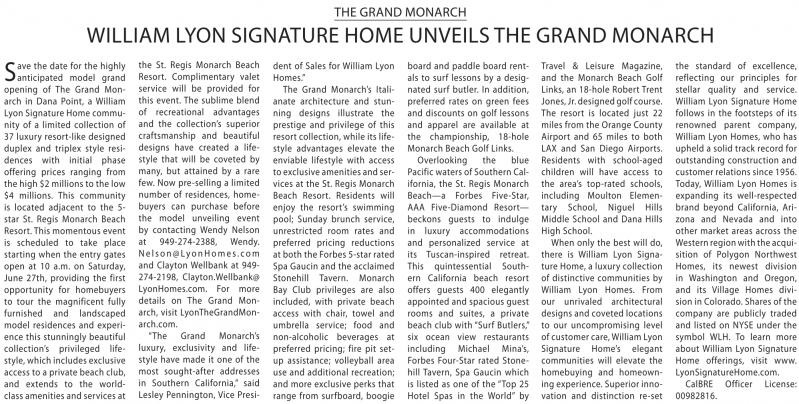 the St. Regis Monarch Beach Resort. complimentary valet service will be provided for this event. The sublime blend of recreational advantages and the collection’s superior craftsmanship and beautiful designs have created a lifestyle that will be coveted by many, but attained by a rare few. now pre-selling a limited number of residences, homebuyers can purchase before the model unveiling event by contacting Wendy nelson at 949-274-2388, Wendy. nelson@LyonHomes.com and clayton Wellbank at 949- 274-2198, clayton.Wellbank@ LyonHomes.com. For more details on The Grand Monarch, visit LyonTheGrandMonarch.com.
