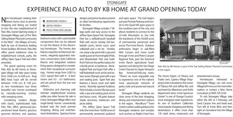 homebuyers seeking their dream home closetopremier shopping and dining are invited to tour the new neighborhood of Palo Alto,Grand Opening todayin stonegate Village,partofthe “Best selling Master Planned Community in the West”-the Villages of Irvine. Built by one of America’s leading home builders,KBHome,Palo Alto offers grand residences close to neighborhood schools, parks, the Jeffrey Open spaceTrail and other amenities.