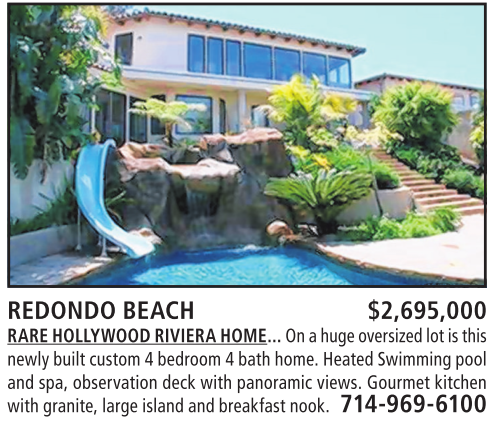 REDONDO BEACH $2,695,000 RARE HOLLYWOODRIVIERAHOME... On ahugeoversizedlot is this newlybuilt custom 4bedroom 4bathhome.Heated Swimmingpool and spa, observation deck with panoramic views. Gourmet kitchen withgranite,large island andbreakfast nook. 714-969-6100