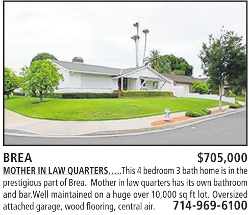 BREA $705,000 MOTHER IN LAWQUARTERS…..This 4bedroom3bath home is in the prestigious part of Brea. Motherinlaw quartershas itsown bathroom and bar.Well maintained on ahuge over 10,000 sq ft lot. Oversized attachedgarage, wood flooring, centralair. 714-969-6100