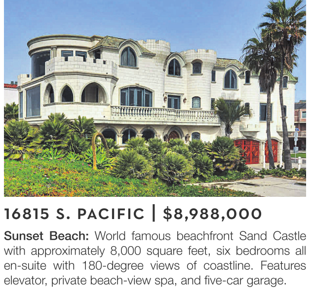 Sunset Beach: World famous beachfront Sand Castle with approximately 8,000 square feet, six bedrooms all en-suite with 180-degree views of coastline. Features elevator, private beach-view spa, and five-car garage.