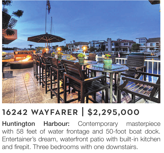 Huntington Harbour: Contemporary masterpiece with 58 feet of water frontage and 50-foot boat dock. Entertainer’s dream, waterfront patio with built-in kitchen and firepit. Three bedrooms with one downstairs.