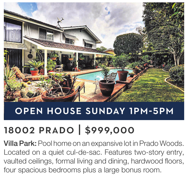 OPEN HOUSE SUNDAY 1PM-5PM 18002 PRADO | $999,000 Villa Park: Pool home on an expansive lot in Prado Woods. Located on a quiet cul-de-sac. Features two-story entry, vaulted ceilings, formal living and dining, hardwood floors, four spacious bedrooms plus a large bonus room.