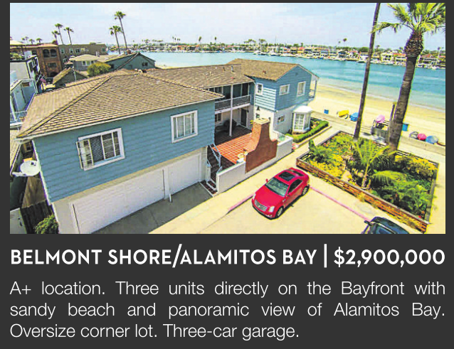 A+ location. Three units directly on the Bayfront with sandy beach and panoramic view of Alamitos Bay. Oversize corner lot. Three-car garage.