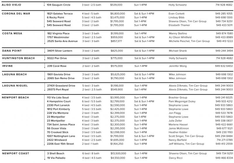 NEWPORT BEACH 113 Via Lido Soud 4 bed | 3.5 bath $3,995,000 Sun 1-4PM Brashier Group 949 241 6025 4 Hampshire Court 6 bed | 5.5 bath $2,799,000 Sat & Sun 1-4PM Pam Megonigal Duley 949 933 4212 2330 Port Lerwick 4 bed | 4.5 bath $2,590,000 Sun 1-4PM Stephanie Lowe 949 933 5863 1812 Port Kimberly 5 bed | 3.5 bath $2,425,000 Sun 1-4PM Stephanie Lowe 949 933 5863 228 Via Mentone 2 bed | 3 bath $2,399,000 Sun 1-4PM Jon Flagg 949 533 7878 23 Montpellier 4 bed | 3 bath $2,375,000 Sat 1-4PM Stephanie Lowe 949 933 5863 23 Montpellier 4 bed | 3 bath $2,375,000 Sun 1-4PM Julia Zeiler 949 338 0837 734 Saint James Place 4 bed | 3 bath $2,300,000 Sun 1-4PM Marlene Hassel 949 422 6661 56 Ocean Vista 3 bed | 3 bath $2,295,000 Sun 1-4PM Jamie McKinnon 949 677 1021 70 Crooked Stick 3 bed | 3.5 bath $2,098,000 Sun 1-4PM Heather Kidder 949 230 1193 1007 Nottingham Lane 4 bed | 3.5 bath $1,799,000 Sat & Sun 1-4PM Scott Singer, Tim Carr Group 949 294 8484 2422 Windward 4 bed | 2.5 bath $1,695,000 Sun 1-4PM Nancy Barfield 714 271 0789 2206 East 15th Street 2 bed | 1 bath $1,164,250 Sun 1-4PM Jeff Williams, Tim Carr Group 949 413 2559