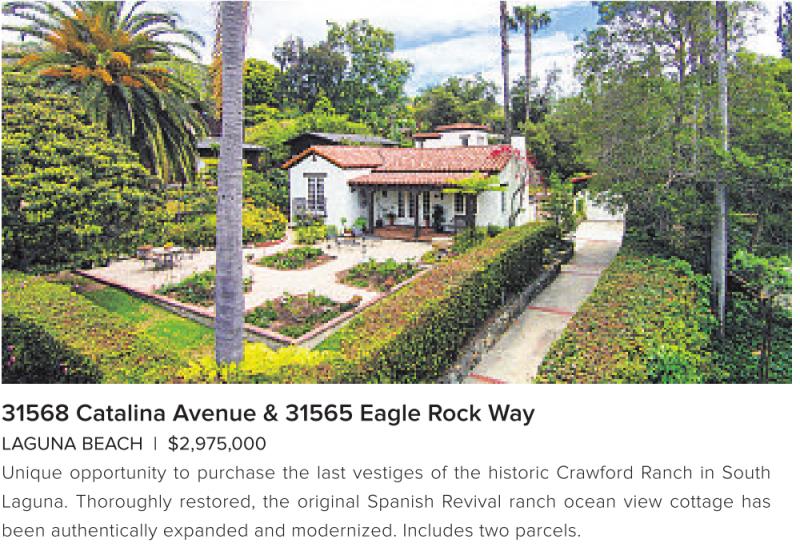 31568 Catalina Avenue & 31565 Eagle Rock Way LAGUNA BEACH | $2,975,000 Unique opportunity to purchase the last vestiges of the historic Crawford Ranch in South Laguna. Thoroughly restored, the original Spanish Revival ranch ocean view cottage has been authentically expanded and modernized. Includes two parcels.