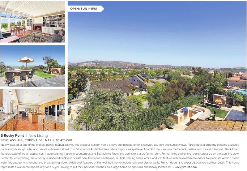 OPEN: SUN 1-4PM 6 Rocky Point | New Listing SPYGLASS HILL, CORONA DEL MAR | $3,475,000 Ideally located at one of the highest points in Spyglass Hill, this gracious custom home enjoys stunning panoramic canyon, city light and sunset views. Rarely does a property become available on this highly sought after and private cul-de-sac street. This 5 bedroom 4.5 bath estate offers a spacious split level floorplan that captures the beautiful vistas from almost all rooms. The kitchen features state of the art appliances, maple cabinetry, granite countertops and Spanish tile floors and opens to a large family room. Formal living and dining rooms capitalize on the stunning view. Perfect for entertaining, the recently remodeled backyard boasts beautiful stone hardscape, multiple seating areas, a “fire and ice” feature with an oversized outdoor fireplace set within a stone waterfall, outdoor kitchenette and breathtaking views. Additional features of this well-built home include lath and plaster walls, French doors and exposed beamed ceilings detail. This home represents a wonderful opportunity for a buyer looking to put their personal touches on a large home on spacious and ideally located lot. 6RockyPoint.com See also