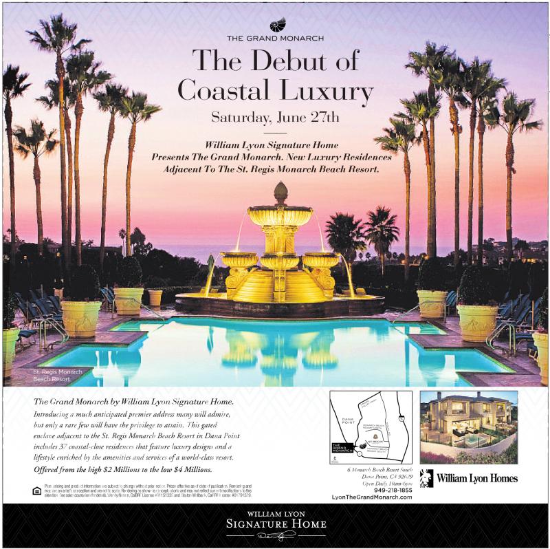 MAP NOT TO SCALE The Debut of Coastal Luxury Saturday, June 27th William Lyon Signature Home Presents The Grand Monarch. New Luxury Residences Adjacent To The St. Regis Monarch Beach Resort. St. Regis Monarch Beach Resort The Grand Monarch by William Lyon Signature Home. Introducing a much anticipated premier address many will admire, but only a rare few will have the privilege to attain. This gated enclave adjacent to the St. Regis Monarch Beach Resort in Dana Point includes 37 coastal-close residences that feature luxury designs and a lifestyle enriched by the amenities and services of a world-class resort. Offered from the high $2 Millions to the low $4 Millions. Plan, pricing and product information aresubject to change withoutprior notice. Prices eff ective as ofdateofpublication. Rendering and map are an art ist’s conception and are not to scale.Rendering asshownis conceptualonlyand may not reflectcurrentmodifications tothis elevation. See sales counselors fordetails.Wendy Nelson, CalBRE License #01159335 and Clay on Wellbank,CalBRELicense #01791539. dana point 5 the grand monarch 1 6 Monarch Beach Resort South Dana Point, CA 92629 OpenDaily10am-6pm 949-218-1855 LyonTheGrandMonarch.com