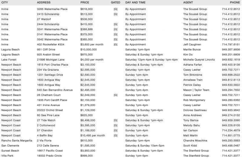 CITY ADDRESS PRICE GATED DAY AND TIME AGENT PHONE Irvine 3265 Watermarke Place $618,000 [G] By Appointment The Soussé Group 714.412.8512 Irvine 2413 Scholarship $513,000 [G] By Appointment The Soussé Group 714.412.8512 Irvine 27 Waldorf $508,000 By Appointment The Soussé Group 714.412.8512 Irvine 2444 Scholarship $415,000 [G] By Appointment The Soussé Group 714.412.8512 Irvine 3241 Watermarke Place $388,888 [G] By Appointment The Soussé Group 714.412.8512 Irvine 3141 Watermarke Place $375,000 [G] By Appointment The Soussé Group 714.412.8512 Irvine 3342 Watermarke Place $365,000 [G] By Appointment The Soussé Group 714.412.8512 Irvine 402 Rockefeller #304 $3,600 per month [G] By Appointment Jeff Caughren 714.797.6151 Laguna Beach 951 Cliff Drive $10,000,000 Saturday 1pm-5pm Marilie Bunce 949.357.9936 Laguna Beach 925 Avalon Street $875,000 Saturday & Sunday 1pm-4pm Kim Do 949.201.6809 Lake Forest 21896 Michigan Lane $4,000 per month Saturday 12pm-4pm & Sunday 1pm-4pm Michelle Queyrel Linovitz 949.632.1618 Newport Beach 1615 Port Charles Place $3,150,000 Saturday & Sunday 1pm-4pm Adriana Farfan 949.400.9136 Newport Beach 234 Via Graziana $2,595,000 Saturday 1pm-4pm Casey Lesher 949.702.7211 Newport Beach 1201 Santiago Drive $2,590,000 Sunday 1pm-4pm Tom Birkinbine 949.698.2522 Newport Beach 1600 Antigua Way $2,545,000 Saturday 1pm-4pm Annaliese Train 949.812.8113 Newport Beach 1600 Antigua Way $2,545,000 Sunday 1pm-4pm Patrick Dailey 949.630.5822 Newport Beach 540 San Bernardino Avenue $2,495,000 Sunday 1pm-4pm Mason | Taylor Team 949.294.7832 Newport Beach 26 Chatham Court $2,349,000 [G] Sunday 1pm-4pm Casey Lesher 949.702.7211 Newport Beach 1935 Port Cardiff Place $2,150,000 Saturday 1pm-4pm Rob Montgomery 949.280.6362 Newport Beach 431 Irvine Avenue $1,379,000 Sunday 1pm-4pm Casey Lesher 949.702.7211 Newport Beach 20222 Orchid Street $1,129,000 Saturday & Sunday 1pm-4pm Dolores Gastineau 949.933.9842 Newport Beach 60 Sea Pine Lane $825,000 Sunday 1pm-4pm Anna Andrews 949.274.0132 Newport Coast 27 Tide Watch $8,498,000 [G] Saturday & Sunday 1pm-4pm Tony Bartos 949.939.3390 Newport Coast 2 Cottonwood $3,395,000 [G] Saturday 1pm-4pm Melody Bahu 949.228.6105 Newport Coast 57 Chandon $1,189,000 [G] Sunday 1pm-4pm Ian Carlson 714.234.4879 Newport Coast 4 Baffin Bay $10,495 per month [G] Sunday 1pm-4pm Matt Marlin 714.851.0775 Rancho Santa Margarita 2 Via Floria $610,000 Saturday 1pm-4pm Chandra Moschina 949.293.5883 San Clemente 213 Calle Serena $1,595,000 Saturday & Sunday 10am-5pm Scott Kidd 949.498.0487 Sunset Beach 16617 Pacific Coast $3,950,000 Saturday & Sunday 1pm-5pm The Stanfield Group 714.421.3377 Villa Park 18002 Prado Circle $999,000 Sunday 1pm-5pm The Stanfield Group 714.421.3377