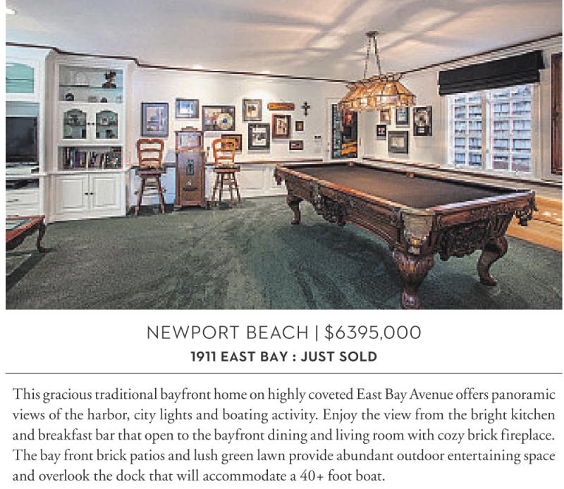 NEWPORT BEACH | $6395,000 1911 EAST BAY : JUST SOLD This gracious traditionalbayfronthomeonhighlycovetedEastBay Avenue offers panoramic views of the harbor, city lights and boating activity. Enjoy the view from the bright kitchen andbreakfast barthatopentothe bayfrontdining andlivingroomwithcozybrick fireplace. Thebay frontbrick patiosand lush greenlawnprovide abundant outdoor entertainingspace and overlook the dock that will accommodate a 40+ foot boat.