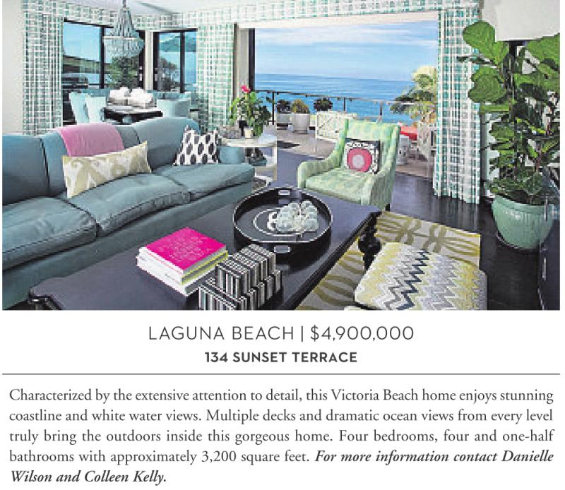 LAGUNA BEACH | $4,900,000 134 SUNSET TERRACE Characterized by the extensive attention to detail, this Victoria Beach home enjoys stunning coastline and white water views. Multiple decks and dramatic ocean views from every level truly bring the outdoors inside this gorgeous home. Four bedrooms, four and one-half bathrooms with approximately 3,200 square feet. For more information contact Danielle Wilson and Colleen Kelly.