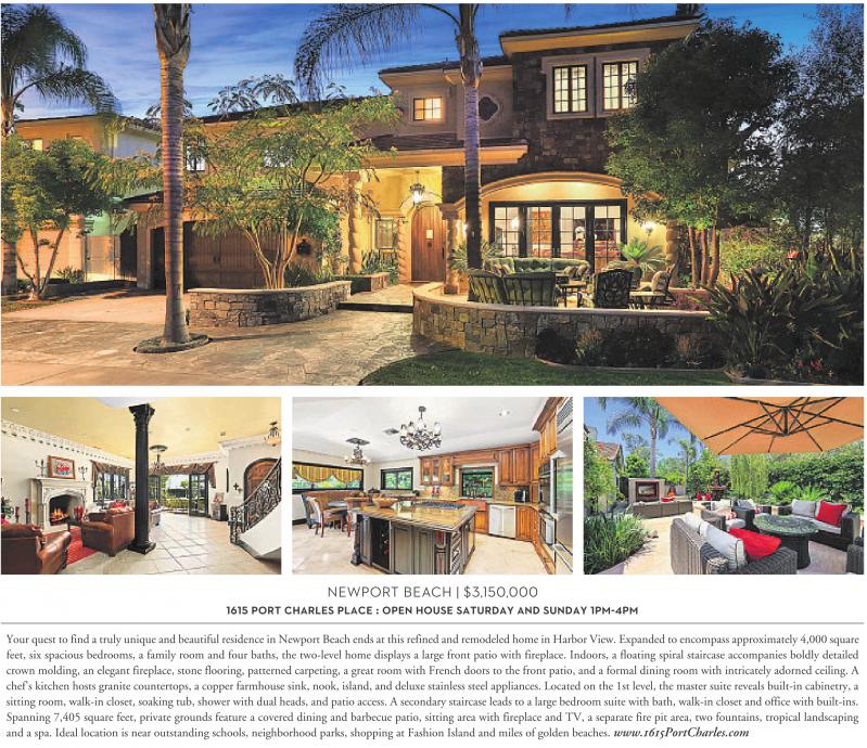 Your quest to find a truly unique and beautiful residence in Newport Beach ends at this refined and remodeled home in Harbor View. Expanded to encompass approximately 4,000 square feet, six spacious bedrooms, a family room and four baths, the two-level home displays a large front patio with fireplace. Indoors, a floating spiral staircase accompanies boldly detailed crown molding, an elegant fireplace, stone flooring, patterned carpeting, a great room with French doors to the front patio, and a formal dining room with intricately adorned ceiling. A chef’s kitchen hosts granite countertops, a copper farmhouse sink, nook, island, and deluxe stainless steel appliances. Located on the 1st level, the master suite reveals built-in cabinetry, a sitting room, walk-in closet, soaking tub, shower with dual heads, and patio access. A secondary staircase leads to a large bedroom suite with bath, walk-in closet and office with built-ins. Spanning 7,405 square feet, private grounds feature a covered dining and barbecue patio, sitting area with fireplace and TV, a separate fire pit area, two fountains, tropical landscaping and a spa. Ideal location is near outstanding schools, neighborhood parks, shopping at Fashion Island and miles of golden beaches. www.1615PortCharles.com