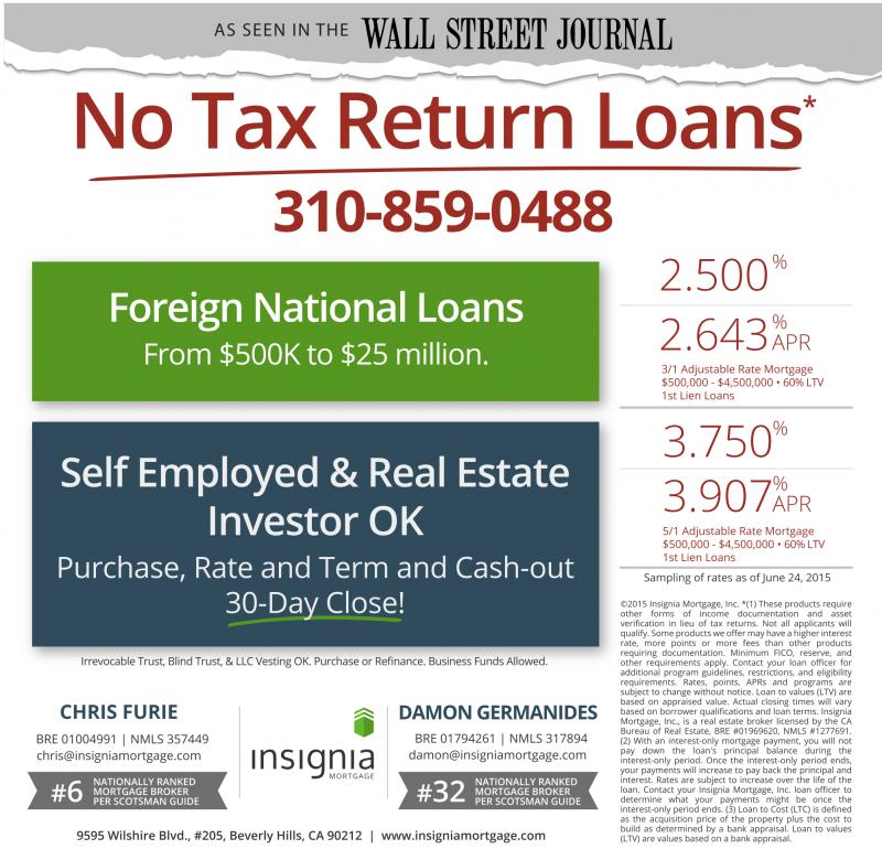 ©2015 Insignia Mortgage, Inc. *(1) These products require other forms of income documentation and asset verification in lieu of tax returns. Not all applicants will qualify. Some products we offer may have ahigher interest rate, more points or more fees than other products requiring documentation. Minimum FICO, reserve, and other requirements apply. Contact your loan officer for additional program guidelines, restrictions, and eligibility requirements. Rates, points, APRs and programs are subject to change without notice. Loan to values (LTV) are based on appraised value. Actual closing times will vary based on borrower qualifications and loan terms. Insignia Mortgage, Inc., is a real estate broker licensed by the CA Bureau of Real Estate, BRE #01969620, NMLS #1277691. (2) With an interest-only mortgage payment, you will not pay down the loan's principal balance during the interest-only period. Once the interest-only period ends, your payments will increase to pay back the principal and interest. Rates are subject to increase over the life of the loan. Contact your Insignia Mortgage, Inc. loan officer to determine what your payments might be once the interest-only period ends. (3) Loan to Cost (LTC) is defined as the acquisition price of the property plus the cost to build as determined by a bank appraisal. Loan to values (LTV) are values based on abank appraisal.