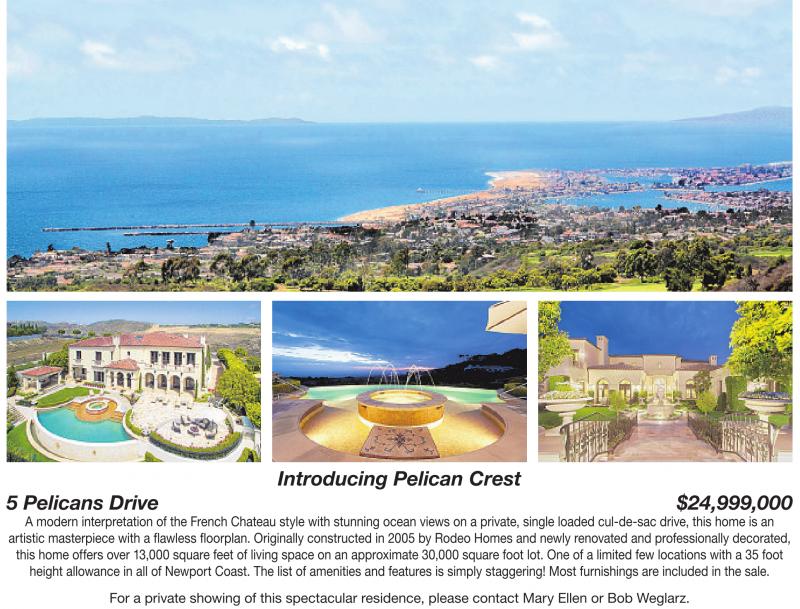Introducing Pelican Crest 5 Pelicans Drive $24,999,000 A modern interpretation of the French Chateau style with stunning ocean views on a private, single loaded cul-de-sac drive, this home is an artistic masterpiece with a flawless floorplan. Originally constructed in 2005 by Rodeo Homes and newly renovated and professionally decorated, this home offers over 13,000 square feet of living space on an approximate 30,000 square foot lot. One of a limited few locations with a 35 foot height allowance in all of Newport Coast. The list of amenities and features is simply staggering! Most furnishings are included in the sale. For a private showing of this spectacular residence, please contact Mary Ellen or Bob Weglarz.