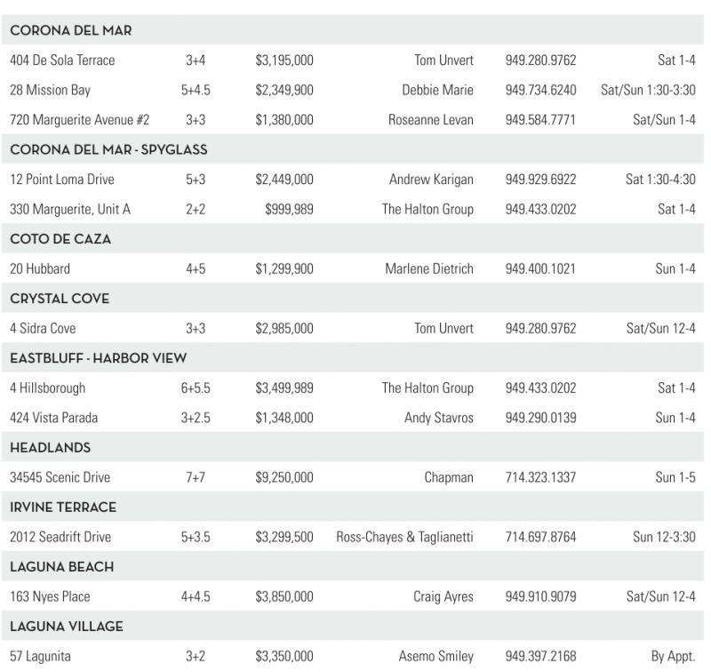 CORONA DEL MAR 404 De Sola Terrace 3+4 $3,195,000 TomUnvert 949.280.9762 Sat 1-4 28 Mission Bay 5+4.5 $2,349,900 Debbie Marie 949.734.6240 Sat/Sun 1:30-3:30 720 Marguerite Avenue #2 3+3 $1,380,000 Roseanne Levan 949.584.7771 Sat/Sun 1-4 CORONA DEL MAR -SPYG SS 12 Point Loma Drive 5+3 $2,449,000 Andrew Karigan 949.929.6922 Sat 1:30-4:30 330 Marguerite, Unit A 2+2 $999,989 The Halton Group 949.433.0202 Sat 1-4 COTO DE CAZA 20 Hubbard 4+5 $1,299,900 Marlene Dietrich 949.400.1021 Sun 1-4 CRYSTAL COVE 4Sidra Cove 3+3 $2,985,000 TomUnvert 949.280.9762 Sat/Sun 12-4 EASTBLUFF -HARBOR VIEW 4Hillsborough 6+5.5 $3,499,989 The Halton Group 949.433.0202 Sat 1-4 424 VistaParada 3+2.5 $1,348,000 Andy Stavros 949.290.0139 Sun 1-4 HEAD NDS 34545 Scenic Drive 7+7 $9,250,000 Chapman 714.323.1337 Sun 1-5 IRVINE TERRACE 2012 Seadrift Drive 5+3.5 $3,299,500 Ross-Chayes &Taglianetti 714.697.8764 Sun 12-3:30 GUNA BEACH 163 Nyes Place 4+4.5 $3,850,000 Craig Ayres 949.910.9079 Sat/Sun 12-4 GUNA VIL GE 57 Lagunita 3+2 $3,350,000 Asemo Smiley 949.397.2168 By Appt. See also