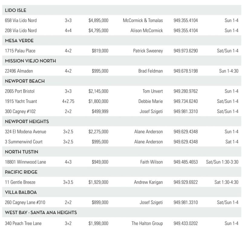 LIDO ISLE 658 ViaLido Nord 3+3 $4,895,000 McCormick &Tomalas 949.355.4104 Sun 1-4 208 ViaLido Nord 4+4 $4,795,000 Alison McCormick 949.355.4104 Sun 1-4 MESAVERDE 1715 Palau Place 4+2 $819,000 Patrick Sweeney 949.973.6290 Sat/Sun 1-4 MISSION VIEJO NORTH 22496 Almaden 4+2 $995,000 Brad Feldman 949.678.5198 Sun 1-4:30 NEWPORTBEACH 2065 Port Bristol 3+3 $2,145,000 TomUnvert 949.280.9762 Sun 1-4 1915 Yacht Truant 4+2.75 $1,800,000 Debbie Marie 949.734.6240 Sat/Sun 1-4 300 Cagney #102 2+2 $499,999 Josef Szigeti 949.981.3310 Sat/Sun 1-4 NEWPORTHEIGHTS 324 El Modena Avenue 3+2.5 $2,275,000 Alane Anderson 949.629.4348 Sun 1-4 3Summerwind Court 3+2.5 $995,000 Alane Anderson 949.629.4348 Sat 1-4 NORTH TUSTIN 18801 Winnwood Lane 4+3 $949,000 Faith Wilson 949.485.4653 Sat/Sun 1:30-3:30 PACIFIC RIDGE 11 Gentle Breeze 3+3.5 $1,929,000 Andrew Karigan 949.929.6922 Sat 1:30-4:30 VIL BALBOA 260 Cagney Lane #310 2+2 $899,000 Josef Szigeti 949.981.3310 Sat/Sun 1-4 WESTBAY -SANTAANA HEIGHTS 340 Peach Tree Lane 3+2 $1,998,000 The Halton Group 949.433.0202 Sun 1-4