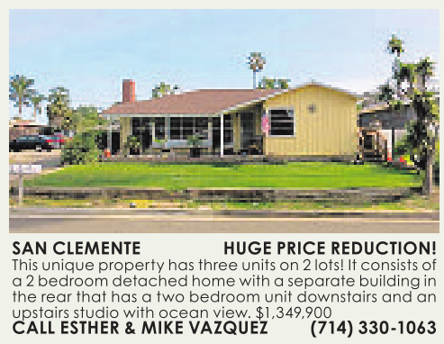 SAN CLEMENTE HUGE PRICE REDUCTION! This unique property has threeunits on 2lots! It consists of a2bedroom detached homewith aseparate buildingin the rear that has atwo bedroom unit downstairs and an upstairs studio with ocean view. $1,349,900 CALL ESTHER &MIKE VAZQUEZ (714) 330-1063