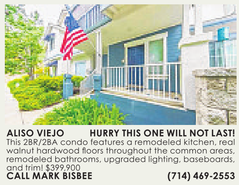 ALISO VIEJO HURRY THIS ONE WILL NOT LAST! This 2BR/2BA condo features aremodeled kitchen, real walnut hardwood floors throughout the common areas, remodeled bathrooms, upgraded lighting, baseboards, and trim! $399,900 CALL MARK BISBEE (714) 469-2553