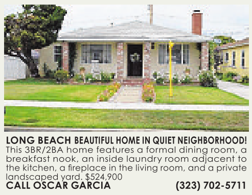 LONG BEACH BEAUTIFUL HOME INQUIET NEIGHBORHOOD! This 3BR/2BA home features a formal dining room, a breakfast nook, an inside laundry room adjacent to the kitchen, afireplace in the living room, and aprivate landscaped yard. $524,900 CALL OSCAR GARCIA (323) 702-5711