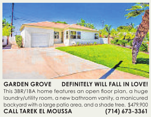 laundry/utility room,anew bathroom vanity,amanicured backyardwithalarge patio area,and ashadetree. $479,900 CALL TAREK ELMOUSSA (714) 673-3361