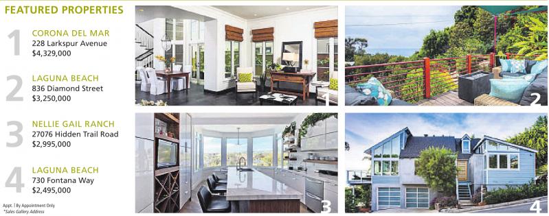 FEATURED PROPERTIES 1 2 3 4 CORONA DEL MAR 228 Larkspur Avenue $4,329,000 LAGUNA BEACH 836 Diamond Street $3,250,000 NELLIE GAIL RANCH 27076 Hidden Trail Road $2,995,000 LAGUNA BEACH 730 Fontana Way $2,495,000 Appt. | By AppointmentOnly *SalesGallery Address See also
