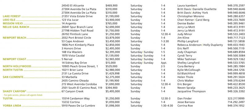 24543 El Alicante $469,900 Saturday 1-4 Laura Isambert 949.370.2597 27304 Avenida De La Plata $310,000 Saturday 1-4 Britt Davis | Danielle Ouellette 949.940.6646 27304 Avenida De La Plata $310,000 Sunday 1-4 Britt Davis | Ashley York 949.940.6646 LAKE FOREST .................................................... 21351 Vista Estate Drive $1,199,000 Saturday 1-4 Christopher Moreno 949.280.6357 LIDO ISLE ........................................................... 123 Via Jucar $3,900,000 Sunday 1-4 Cheri Ketner | Carol Berg 949.233.7600 MISSION VIEJO ................................................. 14 Argento $765,000 Saturday 1-4 Denise Bader 949.395.9461 NELLIE GAIL RANCH......................................... 26041 Spur Branch Lane $2,690,000 Saturday 1-4 Jerry La Mott 949.472.9191 27798 Hidden Trail Road $1,750,000 Sunday 1-4 Jerry La Mott 949.472.9191 26192 Flintlock Lane $1,250,000 Sunday 12:30-4 Judy Minor 949.533.2403 NEWPORT BEACH............................................. 2032 Port Bristol Circle $3,879,000 Sunday 1-4 Jim Kline 949.717.7123 53 Cape Andover $3,450,000 Saturday 1-3:30 Phillip Langford 949.721.5858 1806 Port Kimberly Place $2,850,000 Sunday 1-4 Rebecca Anderson | Holly Duplanty 949.433.1943 3 Honors Drive $2,495,000 Sunday 1-4 Eric Neff 949.500.7119 148 Via Waziers $2,395,000 Saturday | Sunday 1-5 Jody Chapman 949.689.8594 1970 Vista Caudal $1,139,000 Saturday | Sunday 1-4 Cyndi Terry 949.500.5084 NEWPORT COAST............................................. 5 Nerval $2,965,000 Saturday | Sunday 1-4 Mike Tashman 949.929.1362 14 Sidney Bay Drive $15,000 Saturday | Sunday Appt. Shelley Langford 949.533.5765 NORTH HOLLYWOOD....................................... 10905 Peach Grove Street, 1 $529,000 Sunday 2-5 Cora Berkery 949.285.1984 NORTH TUSTIN ................................................. 10211 Brier Lane $2,980,000 Saturday 1-4 Kylie McCollough 949.244.1256 2131 La Cuesta Drive $1,429,998 Sunday 1-4 Ed Blatchford 949.999.4818 SAN CLEMENTE................................................. 33 Marbella $2,275,000 Saturday 1-4 Helen Thole 949.291.5024 2435 Camino Oleada $1,199,900 Saturday 1-4 Chris Walker 949.370.6244 215 West Avenida Cordoba $1,690,000 Saturday 12:30-4 Eric Berger 949.422.8530 2501 South El Camino Real, 119 $394,900 Sunday 1-4 Neven Spralja 949.233.3625 SHADY CANYON ® ............................................. 67 Canyon Creek $5,495,000 Sunday 1-4 Jacqueline Thompson 949.326.3392 -For gate access,pleasecallagentslisted. TUSTIN............................................................... 15514 Cardamon Way $1,250,000 Sunday 12:30-3 Dan Finder 323.217.9999 13232 Cortina $1,059,000 Sunday 1-4 Jesse Barraza 714.292.2497 YORBA LINDA ................................................... 5910 Paseo De La Cumbre $1,098,000 Saturday 1:30-4:30 Corrina Roe 949.374.1952