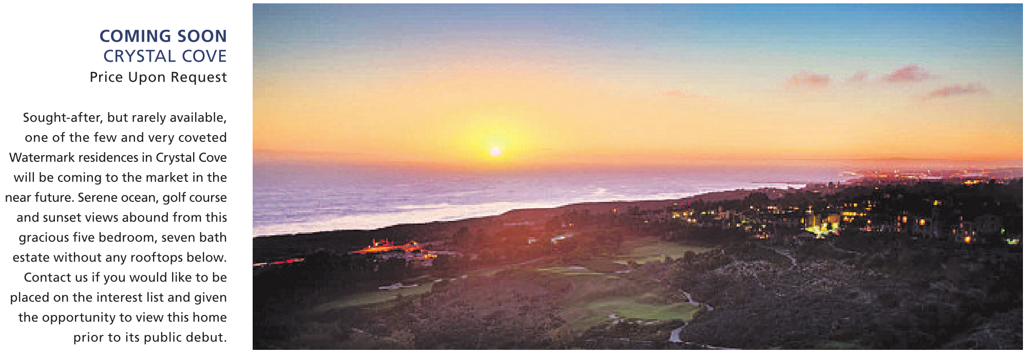 Sought-after, but rarely available, one of the few and very coveted Watermark residences in Crystal Cove will be coming to the market in the near future. Serene ocean, golf course and sunset views abound from this gracious five bedroom, seven bath estate without any rooftops below.