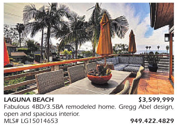 LAGUNA BEACH $3,599,999 Fabulous 4BD/3.5BA remodeled home. Gregg Abel design, open and spacious interior. MLS# LG15014653 949.422.4829