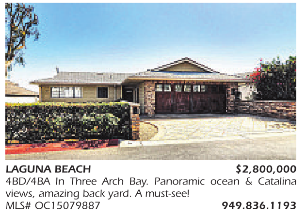 LAGUNA BEACH $2,800,000 4BD/4BA In Three Arch Bay. Panoramic ocean & Catalina views, amazing back yard. A must-see! MLS# OC15079887 949.836.1193