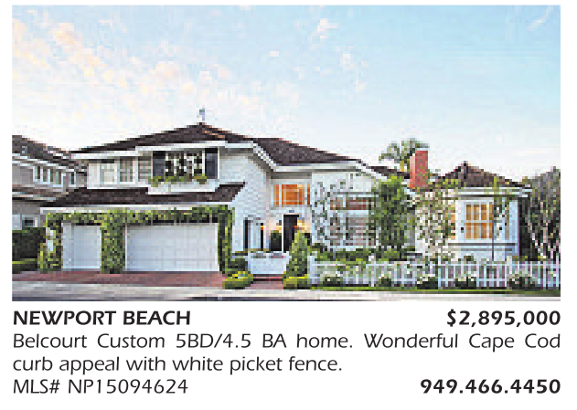 NEWPORT BEACH $2,895,000 Belcourt Custom 5BD/4.5 BA home. Wonderful Cape Cod curb appeal with white picket fence. MLS# NP15094624 949.466.4450