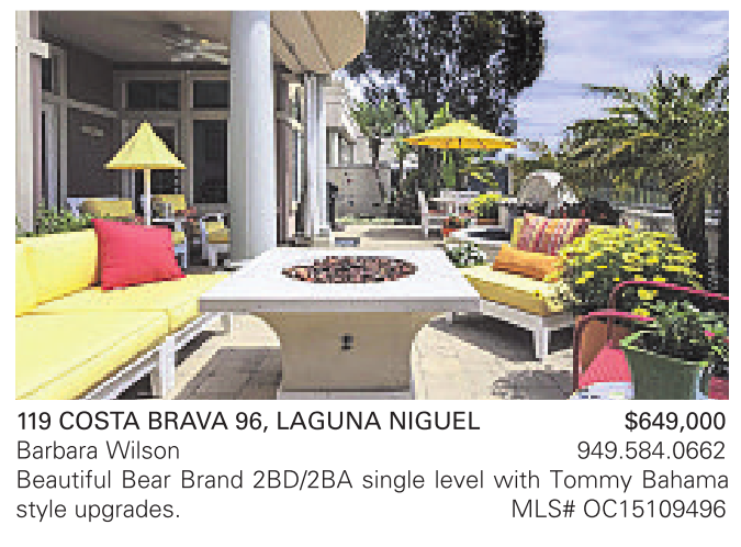119 COSTA BRAVA 96, LAGUNA NIGUEL $649,000 Barbara Wilson 949.584.0662 Beautiful Bear Brand 2BD/2BA single level with Tommy Bahama style upgrades. MLS# OC15109496
