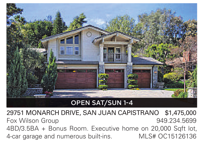 29751 MONARCH DRIVE, SAN JUAN CAPISTRANO $1,475,000 Fox Wilson Group 949.234.5699 4BD/3.5BA + Bonus Room. Executive home on 20,000 Sqft lot, 4-car garage and numerous built-ins. MLS# OC15126136