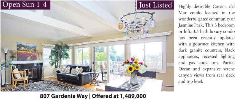 56 Open Sun 1-4 Just Listed Highly desirable Corona del Mar condo located in the wonderful gated community of Jasmine Park. This 3 bedroom or loft, 3.5 bath luxury condo has been recently updated with a gourmet kitchen with dark granite counters, black appliances, recessed lighting and gas cook top. Partial Ocean and expansive serene canyon views from rear deck and top level. 807 Gardenia Way | Offered at 1,489,000