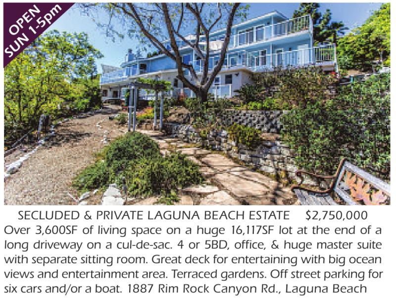 SECLUDED & PRIVATE LAGUNA BEACH ESTATE $2,750,000 Over 3,600SF of living space on a huge 16,117SF lot at the end of a long driveway on a cul-de-sac. 4 or 5BD, office, & huge master suite with separate sitting room. Great deck for entertaining with big ocean views and entertainment area. Terraced gardens. Off street parking for six cars and/or a boat. 1887 Rim Rock Canyon Rd., Laguna Beach