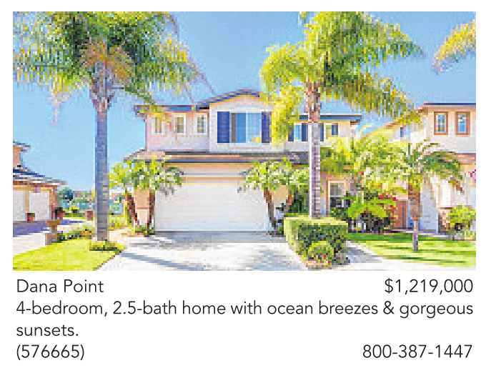 Dana Point $1,219,000 4-bedroom, 2.5-bath home with ocean breezes & gorgeous sunsets. (576665) 800-387-1447