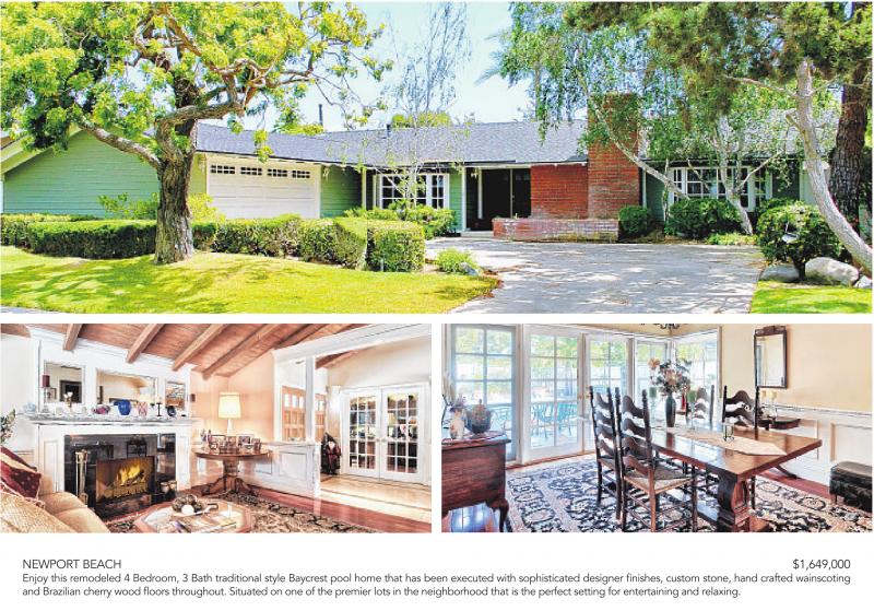 NEWPORT BEACH $1,649,000 Enjoy this remodeled 4 Bedroom, 3 Bath traditional style Baycrest pool home that has been executed with sophisticated designer finishes, custom stone, hand crafted wainscoting and Brazilian cherry wood floors throughout. Situated on one of the premier lots in the neighborhood that is the perfect setting for entertaining and relaxing.