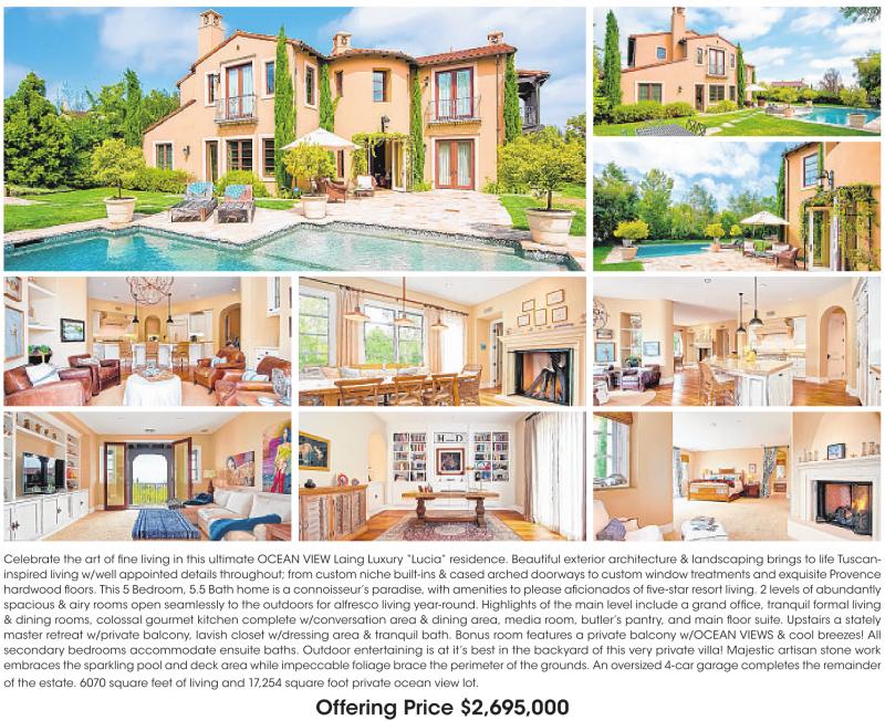 Celebrate the art of fine living in this ultimate OCEAN VIEW Laing Luxury “Lucia” residence. Beautiful exterior architecture & landscaping brings to life Tuscaninspired