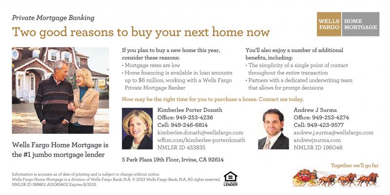 If you plan to buy a new home this year, consider these reasons: • Mortgage rates are low • Home financing is available in loan amounts up to $6 million, working with a Wells Fargo Private Mortgage Banker