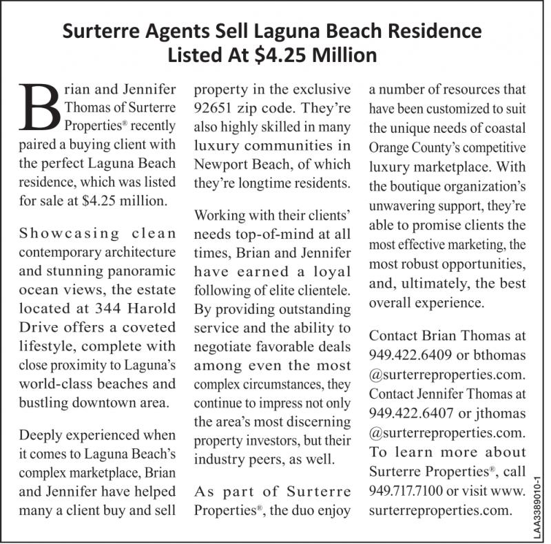 Surterre Agents Sell Laguna Beach Residence Listed At $4.25 Million