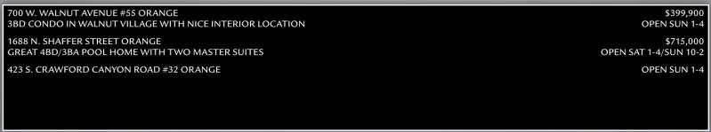 700 W.WALNUT AVENUE #55 ORANGE $399,900 3BD CONDO IN WALNUT VILLAGE WITH NICE INTERIORLOCATION OPEN SUN 1-4 1688 N. SHAFFER STREET ORANGE $715,000 GREAT 4BD/3BA POOL HOME WITH TWOMASTER SUITES OPEN SAT 1-4/SUN 10-2 423 S.CRAWFORD CANYON ROAD #32 ORANGE OPEN SUN 1-4